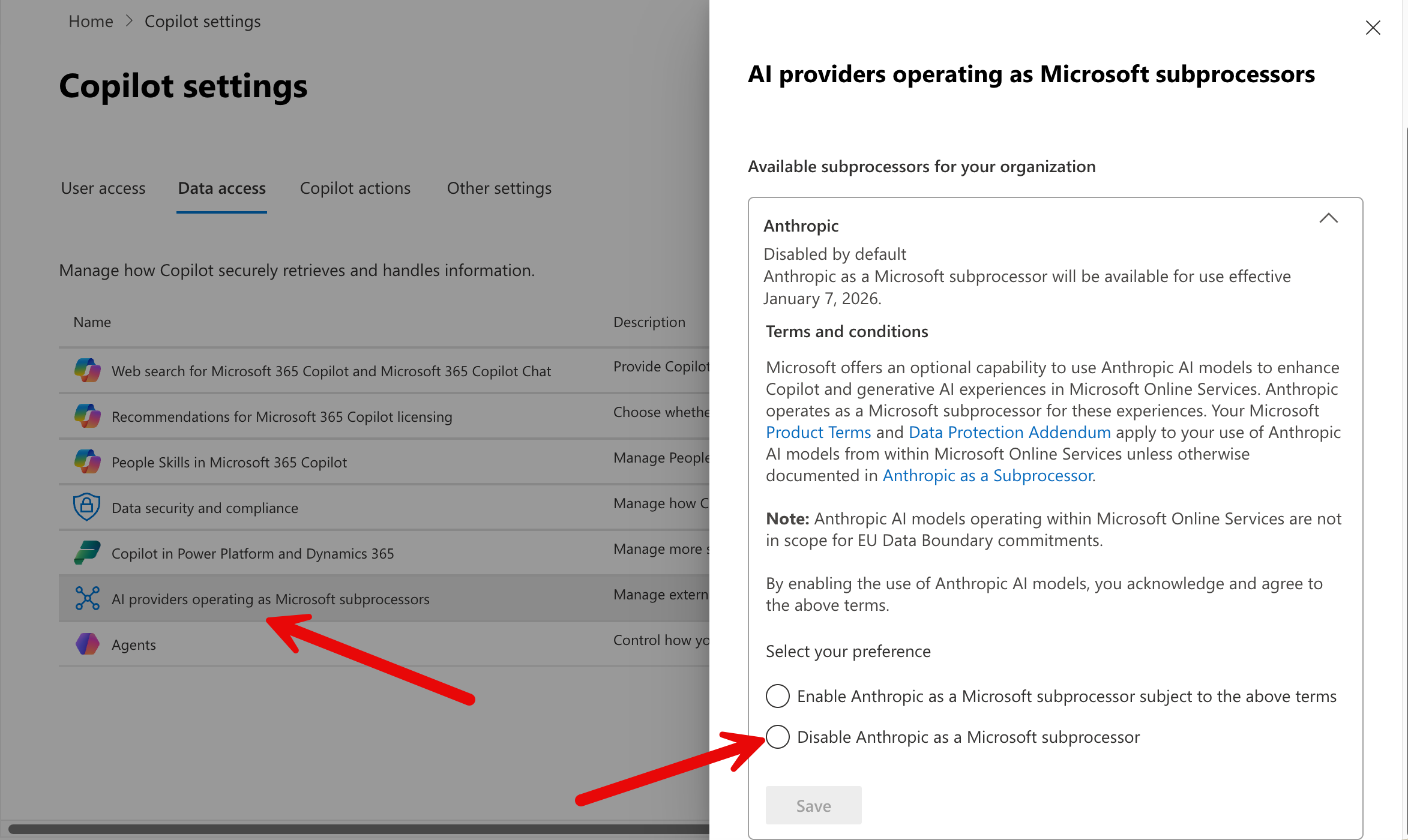 Wir bei Aithoria haben unseren Kunden bereits seit der ersten Claude-Integration im September 2025 geraten, die Anthropic-Option im Admin-Portal nicht zu aktivieren. Der Grund war und ist klar: Anthropic ist nicht Bestandteil der EU Data Boundary von Microsoft. Das bedeutet, dass bei der Nutzung von Claude-Modellen innerhalb von Copilot die Datenverarbeitung nicht innerhalb der EU-Grenzen garantiert wird.