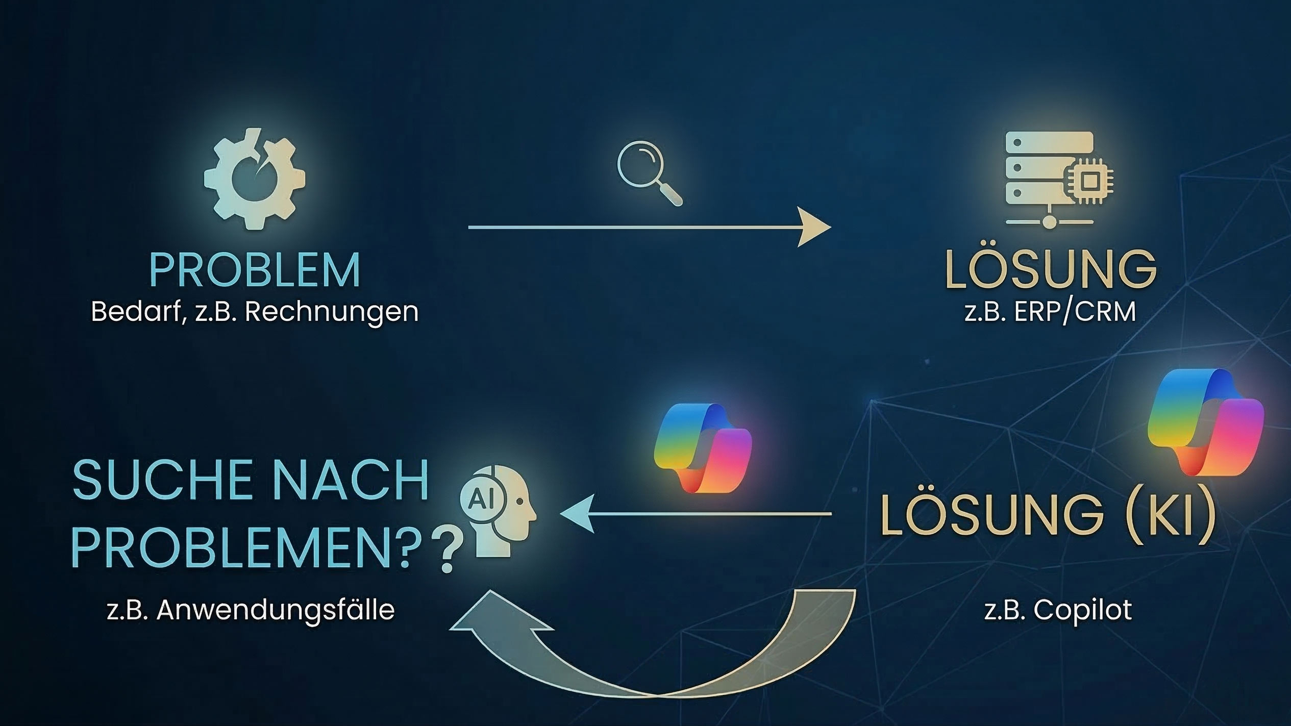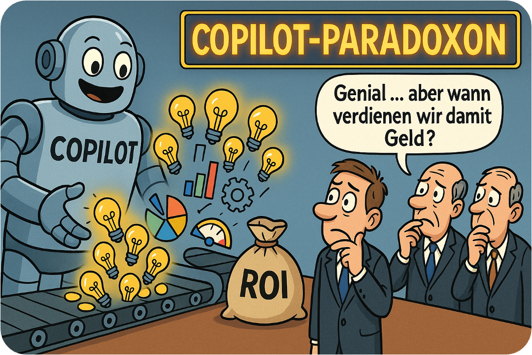 Mit der Einführung von Copilot, ChatGPT und Co. erleben wir zum ersten Mal das genaue Gegenteil: Die Lösung ist da, und nun suchen Unternehmen das passende Problem. Das führt zu genau der Konfusion, die wir täglich in der Praxis sehen.
