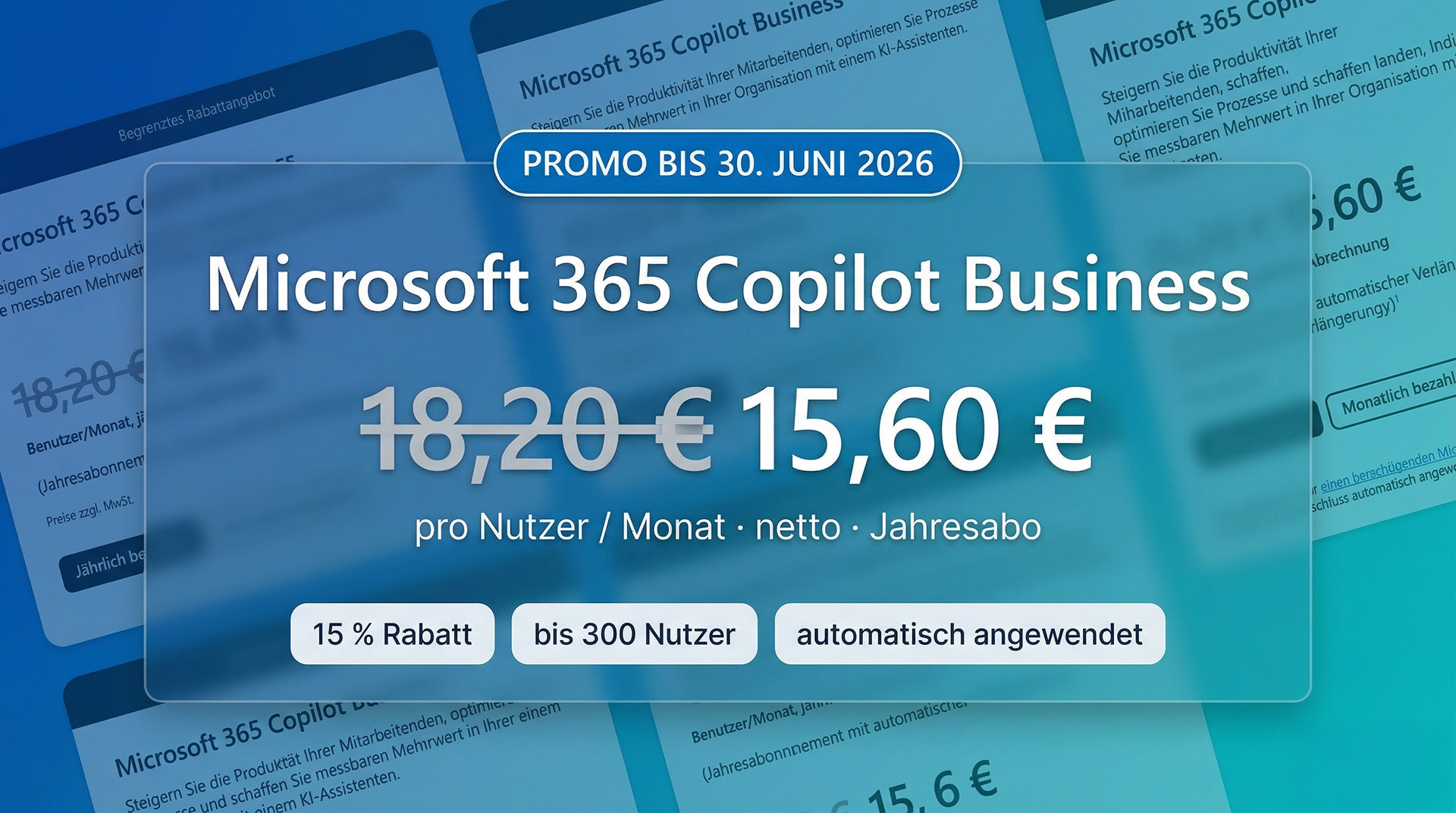Die Promotion läuft bis 30. Juni 2026. Ab dem 1. Juli aktualisiert Microsoft die Preise für die M365-Basispläne und Copilot-Bundles.[2] Der Copilot-Business-Preis selbst bleibt bei 18,20 € (regulär), aber die Gesamtkosten für Basis- plus Copilot-Lizenz steigen. Wer jetzt abschließt, sichert sich die aktuellen Konditionen für das gesamte erste Vertragsjahr.